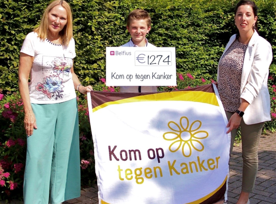 De gezinswandeling in de omgeving van be-MINE, gekoppeld aan snoepverkoop op de markt en in de bib bracht maar liefst 1274 euro op. Het bedrag gaat integraal naar het goede doel dat de kindergemeenteraad zelf uitkoos. Dinsdag 29 juni overhandigden de kinderschepen Noah Naten samen met schepen De Weyer de cheque aan de vertegenwoordiger van Kom op tegen Kanker.